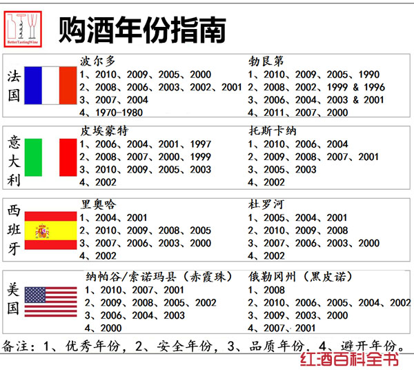 (4)避开年份:坏年份,葡萄生长得不好,酿出的葡萄酒可能缺少果香、酸度或单宁。所以,购酒时切记避开这些年份的酒。