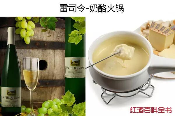 葡萄酒的微甜和酸爽融合了奶酪的坚果仁味,整体变得更加香甜可口,德国微甜的雷司令(Riesling)与奶酪火锅(Fondue)的搭配真是令人难以忘怀。
