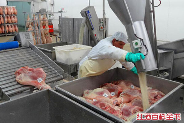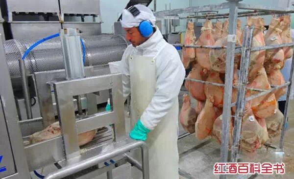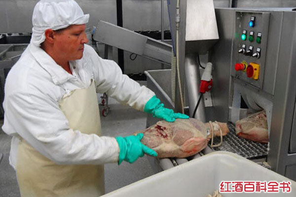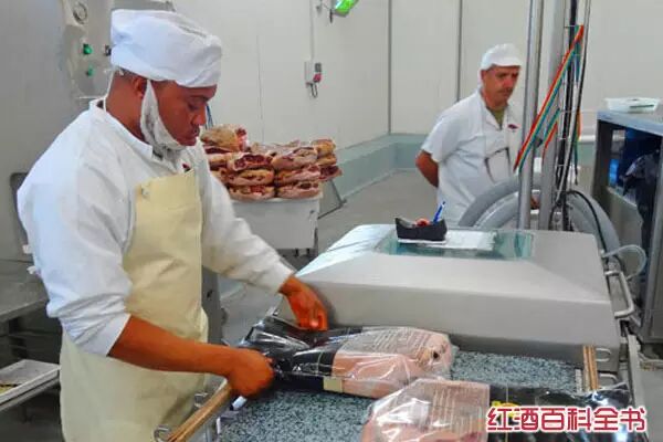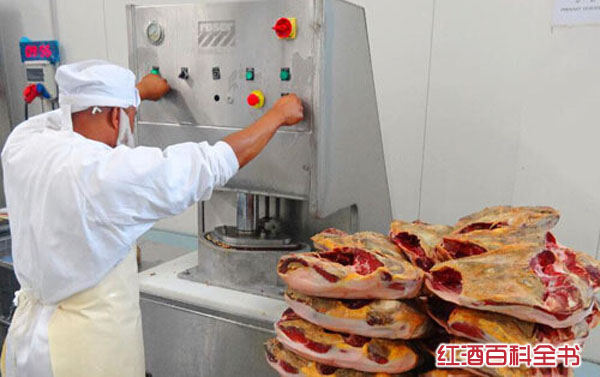 5、在西班牙赫罗纳市附近的“卡萨德蒙特”公司,工人操作机器对剔骨火腿进行挤压,使产品大小基本相同。