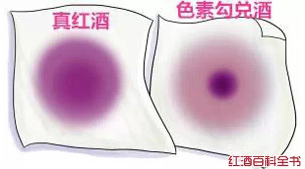 鉴定方法二原理:由于假红葡萄酒中多由酒精、糖精和香精色素勾兑而成,因此色素颗粒大,倒在纸上色素颗粒会沉淀在纸巾中间,往外扩散只是水迹。
