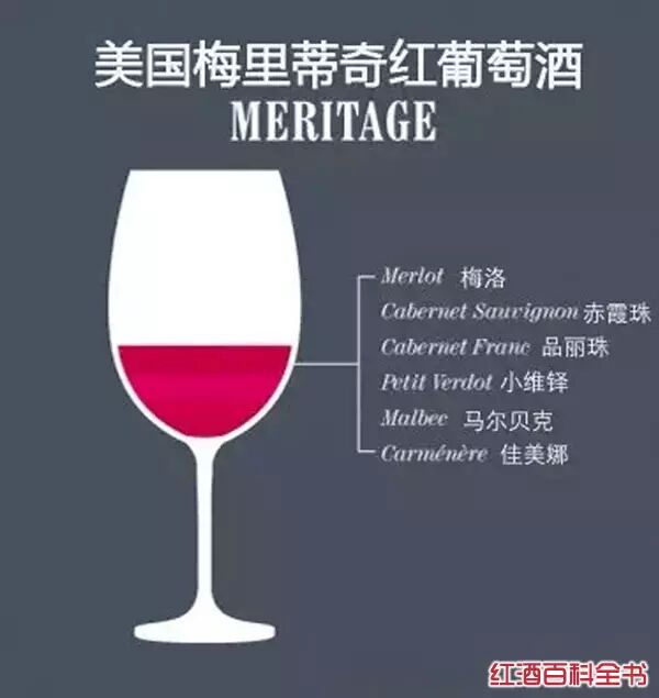 法律规定:红梅里蒂奇(Red Meritage)必须包括赤霞珠、梅洛、品丽珠、马尔贝克、小维多、大维多(Gros