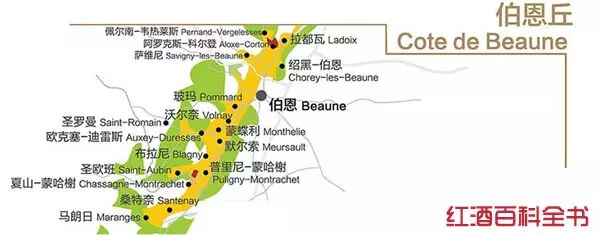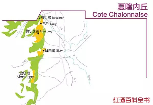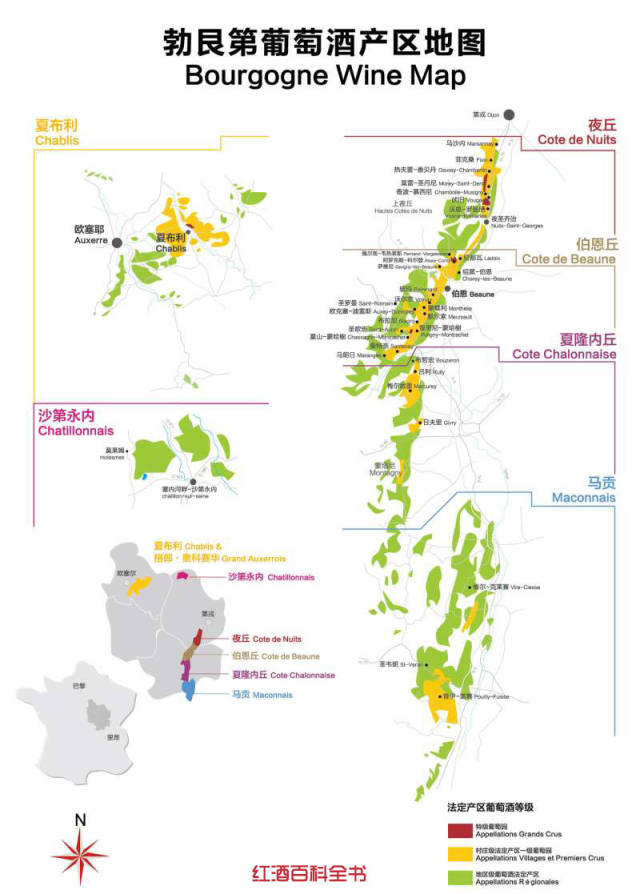 勃艮第位于法国的中部,拥有5个主要的次产区(除博若莱(Beaujolais)和沙第永内(Chatillonnais)之外),即夏布利(Chablis)、夜丘(Cote de Nuits)、伯恩丘(Cote de Beaune)、夏隆内丘(Cote Chalonnaise)和马贡(Maconnais)。请看下图。