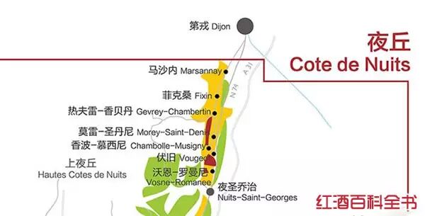 在朝向索恩河谷(Soane River)的东部斜坡上,聚集着一连串特级葡萄园,依次为热夫雷-香贝丹(Gevery Chambertin)、莫雷-圣丹尼(Morey St-Denis)、伏旧(Vougeot)和沃恩-罗曼尼(Vosne Romanee)。很多葡萄园面积很小,由于法国大革命的继承法规定,它们为很多人共同拥有。这些顶级葡萄园所产的黑皮诺葡萄酒拥有数十年的陈年潜力,正因为如此,它们的价格也非常昂贵。