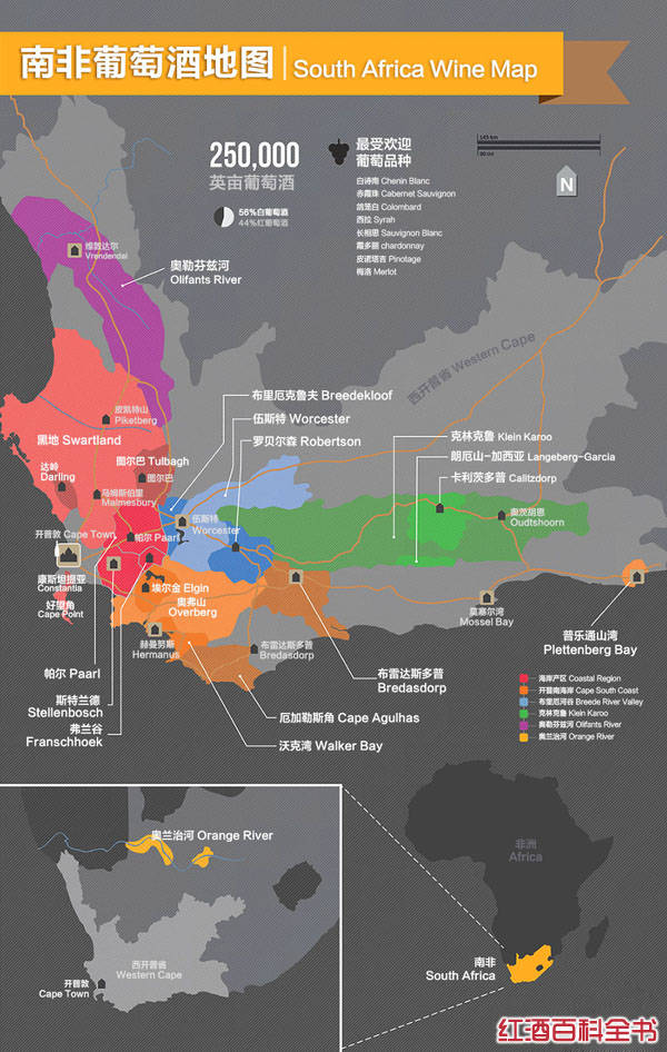 在南非,大约90%的葡萄酒都产自西开普(Western Cape),其他则来自被奥兰治河(Orange