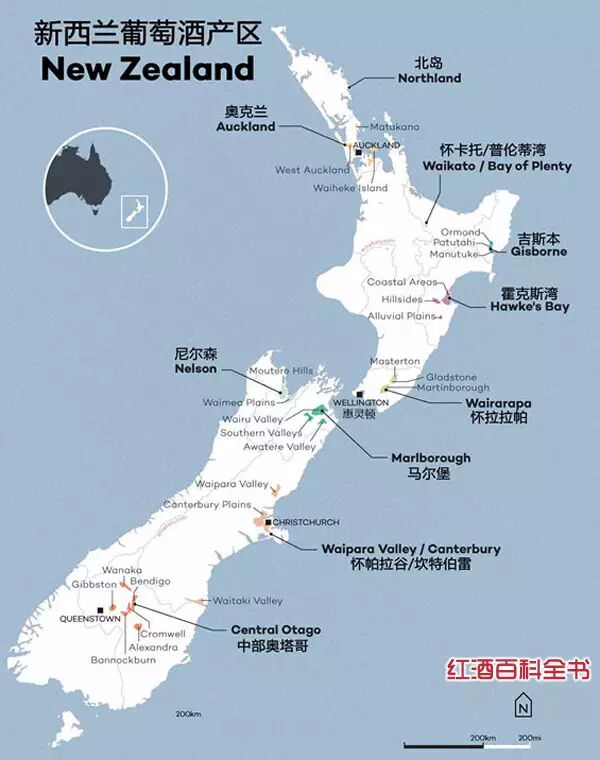 Bay)产区:霍克斯湾是新西兰最古老的产区,这里日照充足,擅长出产类似于波尔多风格的梅洛(Merlot)混酿。另外,这里的长相思热带水果味十足,随着橡木桶陈酿还会发展出浓郁的奶油味。