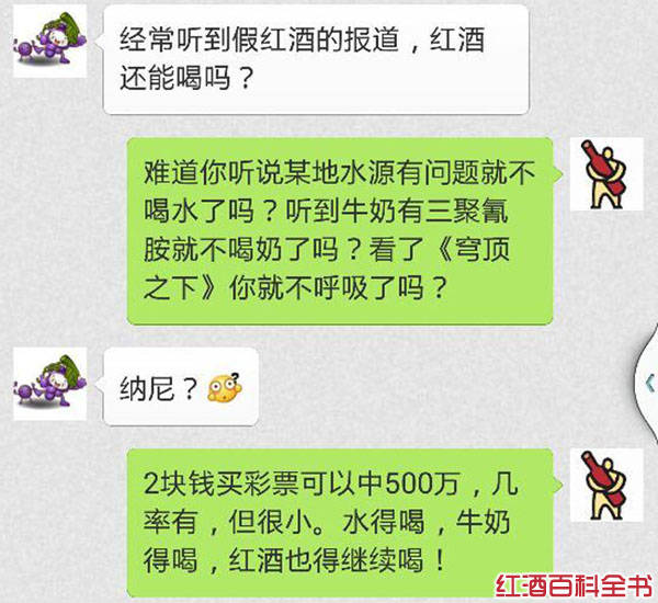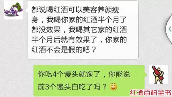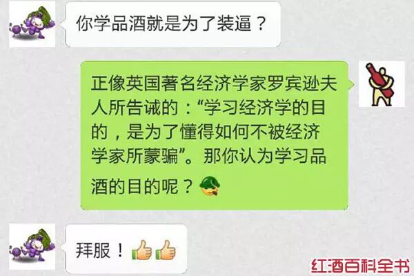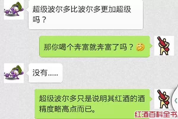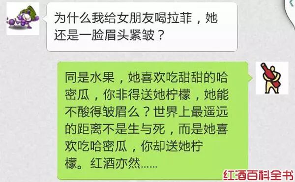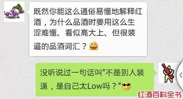 品酒师在跟红酒小白交流红酒时,专业的解答总是让普通人像丈二的和尚摸不着头脑,一头雾水。然而,自从红酒小白和品酒师相互加了微信后,对于红酒小白的提问,品酒师一改以往一本正经的风格,如下这么回答。感谢马化腾,感谢马小龙,微信让红酒也变得更加通俗易懂,百科君真是佩服得五体投地!