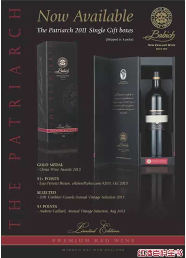 1995年初期,百祺庄园(Babich)为了纪念公司创始人,即新西兰葡萄酒业先驱约瑟普•百祺(Josip•Babich),酿制了这款百祺元老葡萄酒。百祺旨在酿出最佳葡萄酒,因此酿造时发挥充分、灵活,不局限于某一品种,或某种调配,其中葡萄的产量也经过严格控制。百祺团队经过无数次的试酒,直到大家一致认可后才开始酿制这款具有特殊意义的酒款。这款葡萄酒是新西兰获奖最多的红葡萄酒之一,每年RobertParker.com的评分都超过92分,还获得过多项5星大奖。
