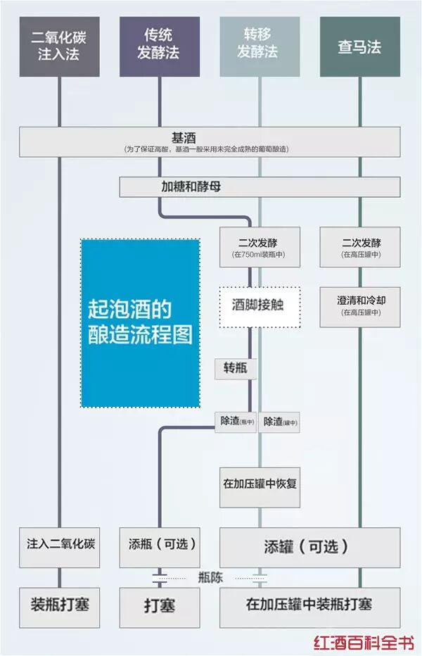 除了传统酿造法,起泡酒的酿造方法还有查马法(Charmat Method)、换瓶法(Transfer Method)和二氧化碳注入法(Carbonation Method)。