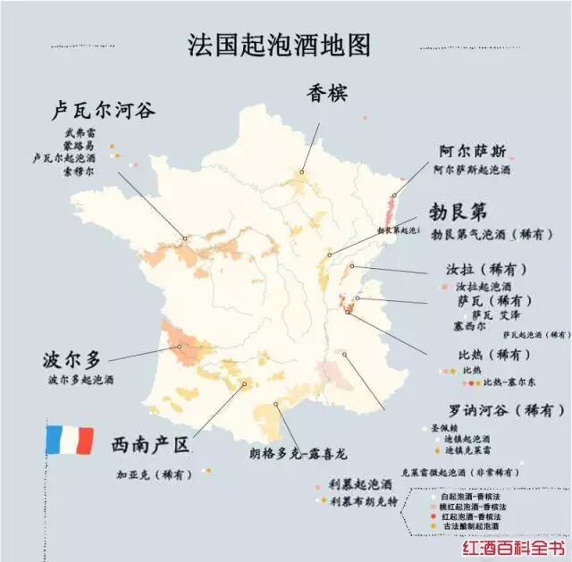 在法国,包括香槟产区在内,共有23个地方出产起泡酒,如下图所示: