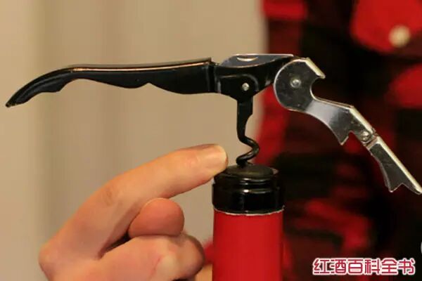 找准位置,将酒刀的螺丝钻缓缓旋转钻入软木塞中。不过,葡萄酒的橡木塞有长有短,要注意钻入的深度,别把软木塞拔断了。