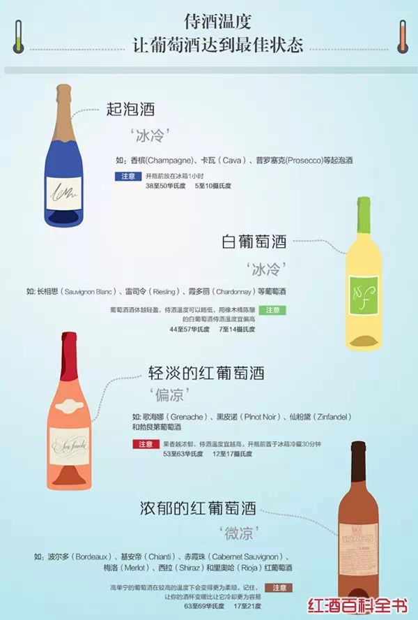 起泡酒:4-7℃的温度可以让你体验起泡酒的完美魅力,不过,香槟和优质起泡酒的侍酒温度则与白葡萄酒类似。