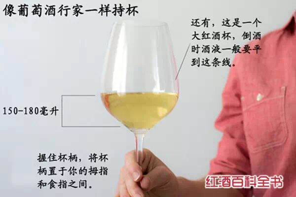 倒好酒后,你怎么来hold住笨重的酒杯而不失优雅的姿态呢?双手的温度会使葡萄酒温度升高,所以不要握住酒杯杯壁,而是握住杯柄,将杯柄置于拇指、食指和中指之间,其他手指自然放置。