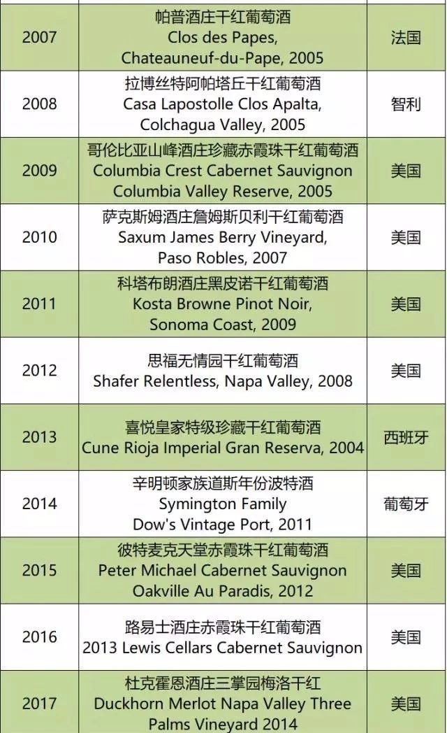 近十年《葡萄酒观察家》第一名名单