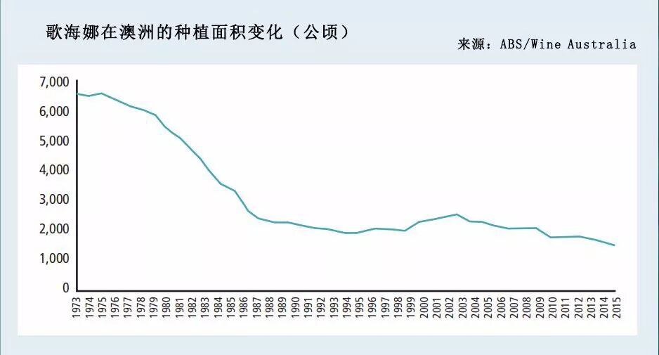 1973 年歌海娜种植面积达到了 5,782 公顷,并在 1975 年达到了 6,060 公顷的高峰(此时西拉种植面积已达到 8,572 公顷并且还在增加)。从 1975 年开始下降,到 1982 年种植面积已降至 4,511 公顷。1984 年,1959 年才引入澳洲的赤霞珠(Cabernet Sauvignon)种植面积已经超过了歌海娜。