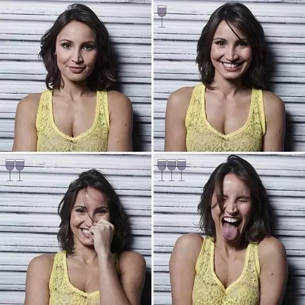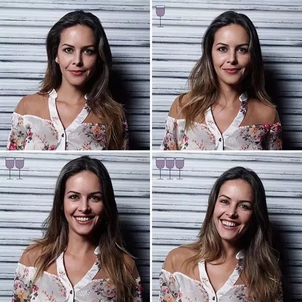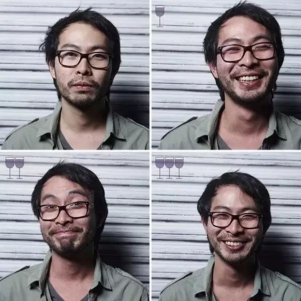 一个人喝了酒到底有什么明显的变化?一位来自巴西的摄影师马科斯•阿尔贝蒂(Marcos Alberti)利用自己对葡萄酒的热情拍摄了一组照片:他邀请了许多朋友来家里喝酒,并记录了 50 多位朋友们在喝酒前和 1-3 杯酒后的 4 种不同状态: