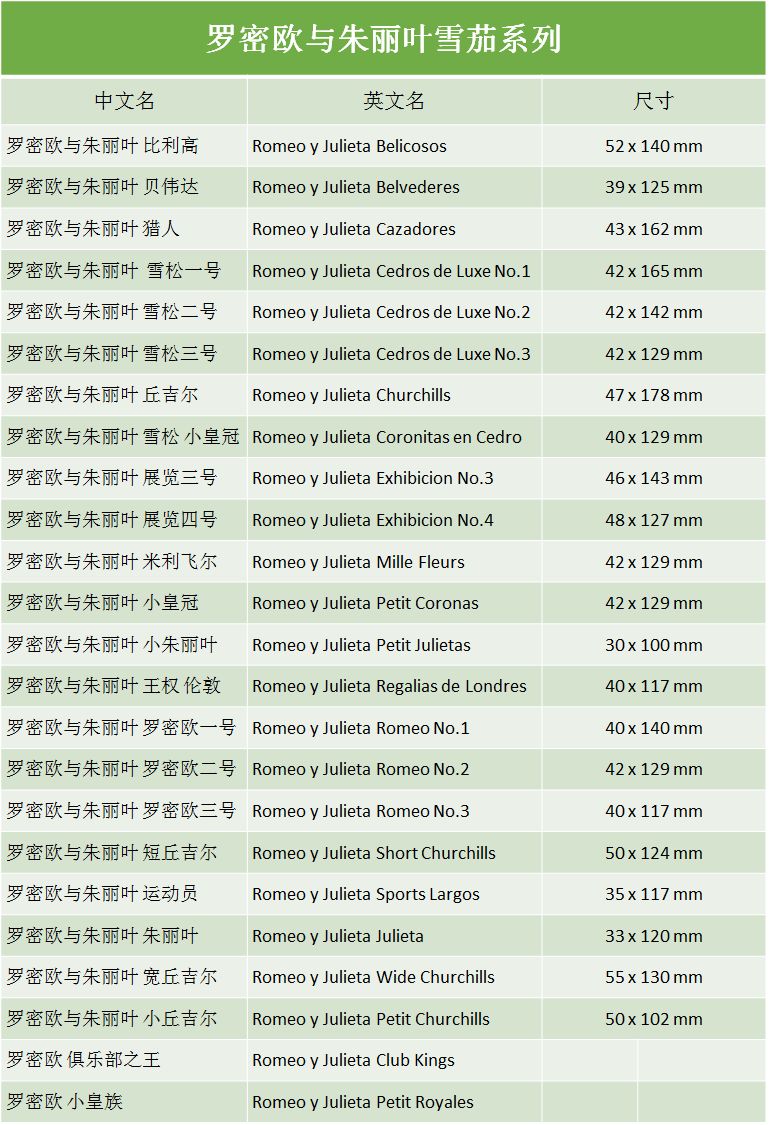 罗密欧与朱丽叶雪茄一开始采用铝管包装,并有许多机器制尺寸。到目前为止,此品牌已经有超过 40 种的各种型号。