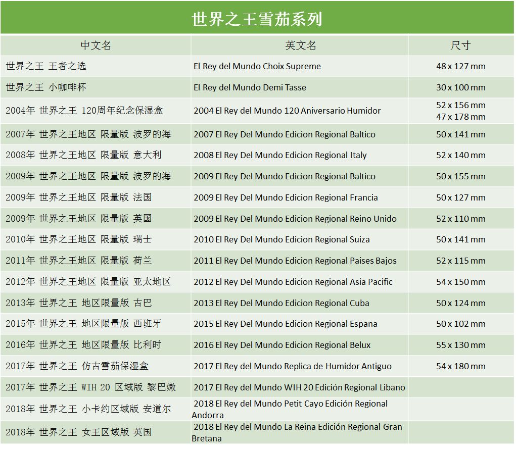 El Rey Del Mundo的意译是“世界之王”, 1848 年由安东尼奥•阿万斯(Antonio Allones)领导下发展成为古巴名牌之一。在 20 世纪中期世界之王雪茄是古巴最贵的雪茄之一。花香、烤面包为主,还有诸如蜂蜜、坚果的味道,但是主要是烤味,需要细品,且略带甜味,味道上比较出彩。