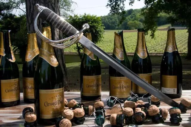 香槟作为胜利之酒一直以来都是胜仗后的标配,在拿破仑时期,战士们凯旋归来后异常兴奋,往往会抽出随身携带的军刀直接砍断香槟的瓶颈,以省去繁琐的开瓶过程,看起来既简单粗暴又豪爽帅气,但同时也非常危险,而且一不小心还容易变成这样: