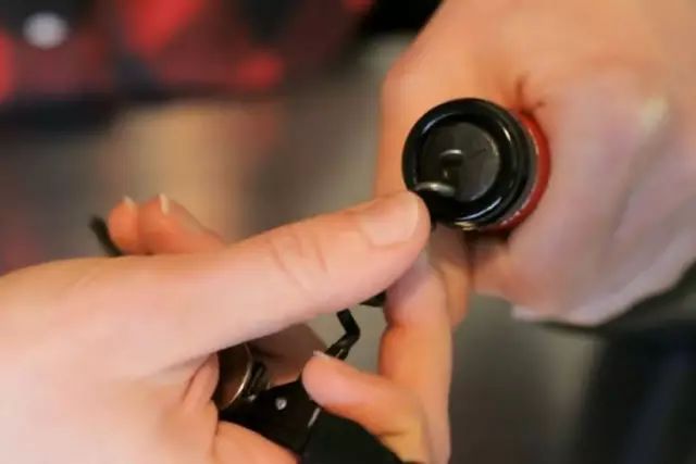 (2)将开瓶器的尖端置于稍微偏离中心的位置(如图),然后将螺旋开瓶器缓慢旋入酒塞中,注意保持垂直旋入。
