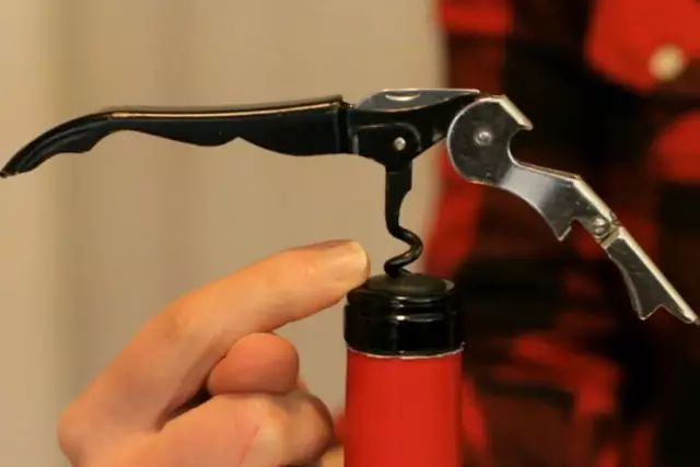 (4)将开瓶器的第一级杠杆卡在瓶口,利用杠杆原理将木塞拔出一部分;接着再用第二级继续上一操作。如果此时木塞还未完全拔出,可以用手握住开瓶器转套处,按旋入时的相反方向扭出木塞即可。