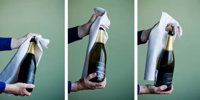 (3)将酒瓶倾斜 30°,记得对准没有人的地方,以免误伤,当然还是要确保一手按紧木塞,另一只手托住底部,并缓慢旋转瓶底(而不是软木塞)。当感觉到软木塞快要推挤至瓶口时,稍微斜推一下瓶塞,腾出一点缝隙,这样一来酒瓶中的气体就会一点点释放,之后就可以直接将瓶塞拔出了。