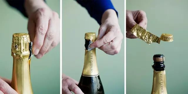 (1)将起泡酒置于桌面上,一只手握住瓶颈下方,另一只手将瓶口的锡纸去除。
