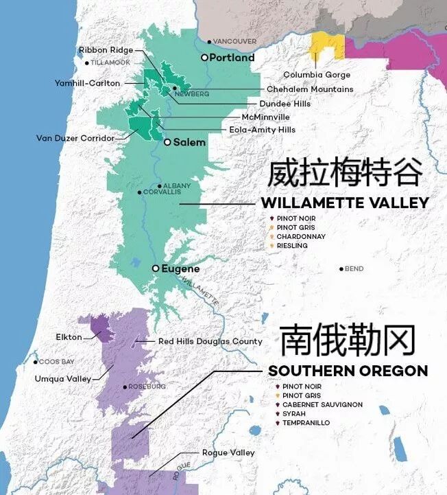 俄勒冈州大致可以分为南北两部分, 90% 的黑皮诺都是来自北部最大的威拉梅特谷(Willamette Valley AVA)产区。威拉梅特谷位于俄勒冈海岸山脉东侧,是世界上最潮湿的葡萄酒产区之一。