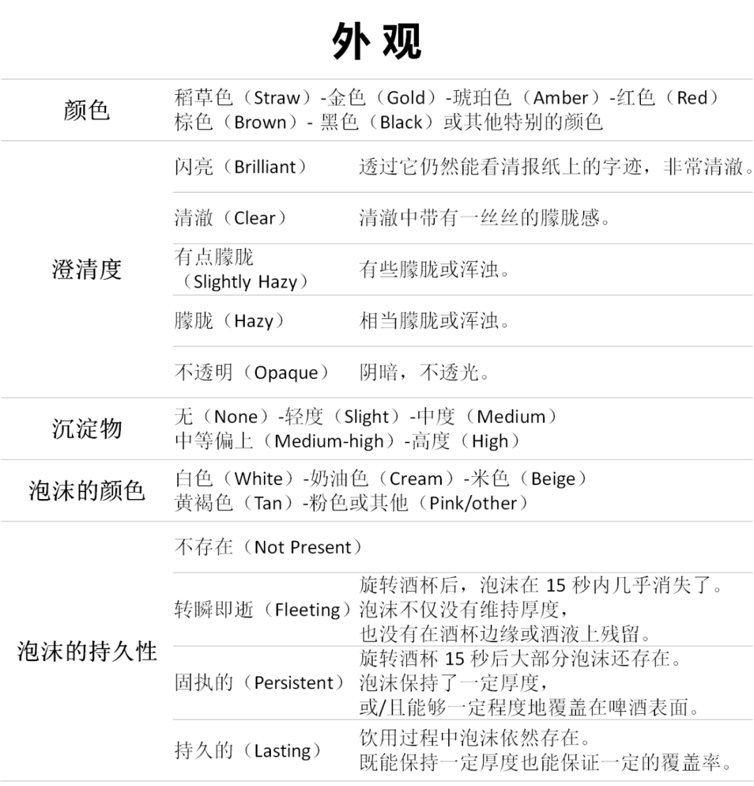 啤酒的外观在品鉴过程中相当重要,可以为我们提供关于啤酒成分、酿造过程以及陈年过程的重要线索。在外观这一项中,我们不仅要观察酒液的颜色,还要注意它的澄清度、是否有沉淀物、泡沫的颜色以及持久度。