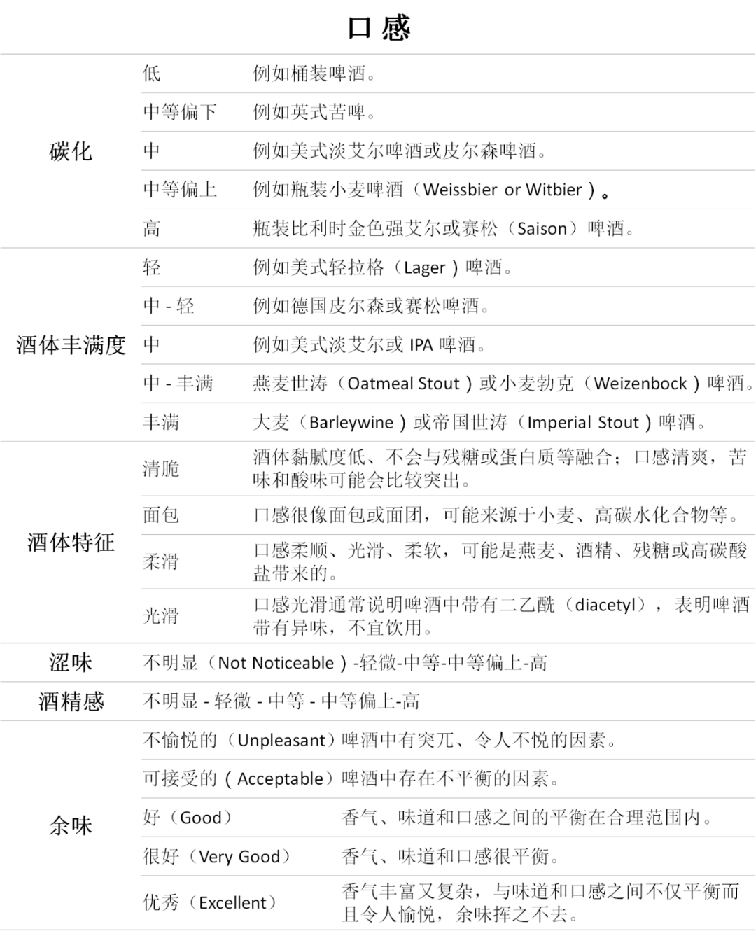 啤酒真实的酸、甜、苦味可以用低(甜不明显,几乎不存在)- 中等偏下(似有似无)- 中(味道明显,但不持久)- 中等偏上(味道很明显)- 高(味道相当明显)来描述啤酒中真实的味道。