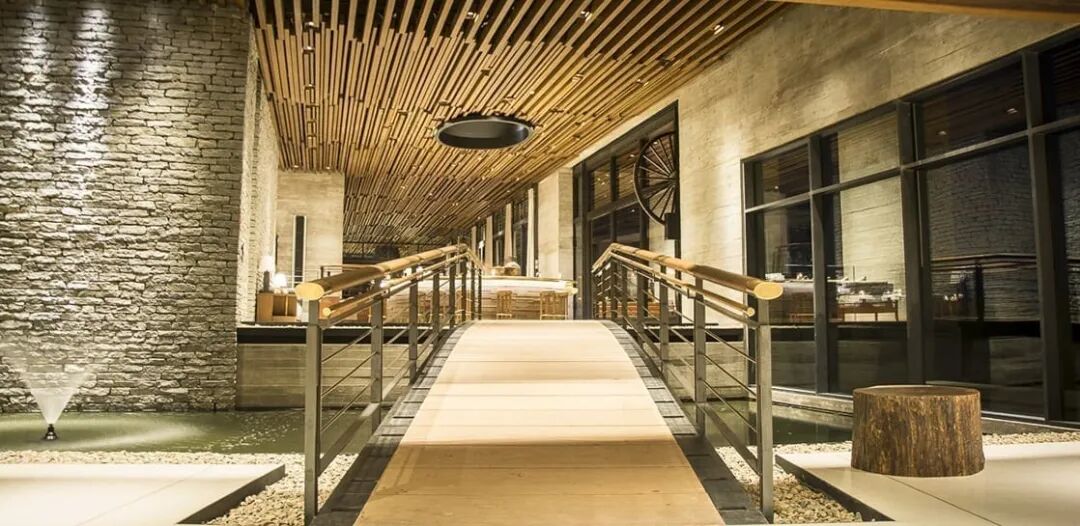 在几位酒庄创始人的坚持下,蒙特斯酒庄建筑采用了中国风水的理论,将水、金和木元素都融入到了设计方案中。酒庄入口处设计了一座木桥跨在小河上,河水的流向也参考了风水。在酒庄中心,百合花造型的天窗下还设有一处喷泉。