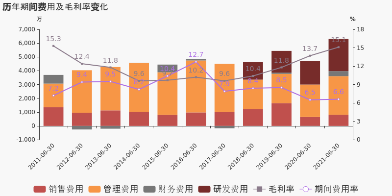 公司2021半年度营业成本8.1亿,同比增长30.9%,低于营业收入33.2%的增速,导致毛利率上升1.5%。期间费用率为6.6%,同去年相比变化不大。公司研发投入大幅增加,相比去年同期增长35.7%达到2338.4万。