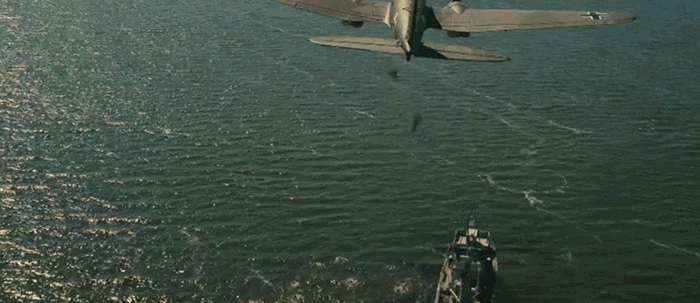 诺兰说,《敦刻尔克》里安排的战斗场面,是想让人把注意力集中在海滩上的人,天上的战斗机俯冲,下落的炸弹,告诉着就算离开沙滩,也有鱼雷和飞机的攻击。