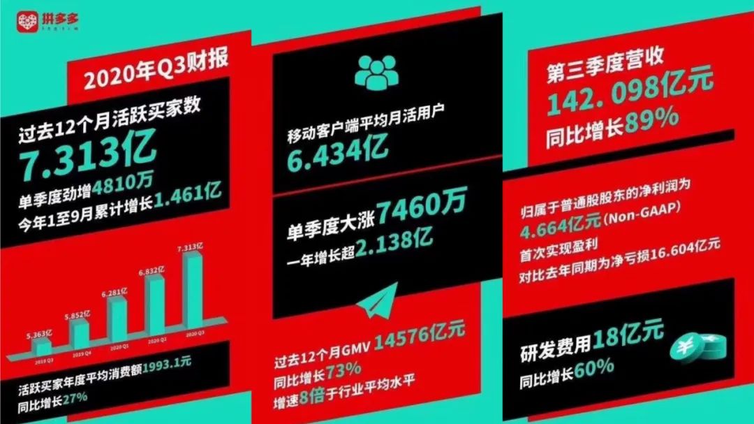 - 实现盈利。第三季度,拼多多营收超过142亿元,同比增长89%。划重点,拼多多第三季度NON-GAAP净利达到4.664亿元,首次实现季度盈利。