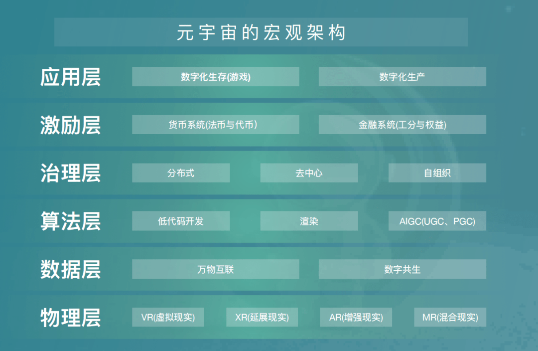 万向集团肖风博士,从区块链角度对元宇宙有一个宏观分析。他认为,元宇宙有一个六层架构,自下而上分别是物理层、数据层、算法层、治理层、激励层和应用层。
