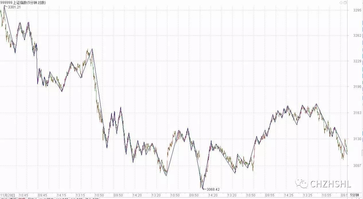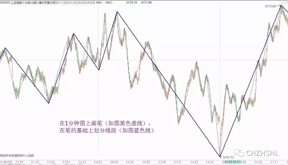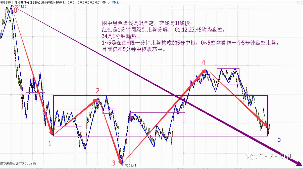 因为1f图上已经是严格按照笔段划分来了。所以把它搬到5分图上来,就是只关心划分的结果就行了,把1分线段的起始和结束点搬过来,连接起来,就是1分线段。在此基础上,由1分线段构成1f中枢,画出1分走势。