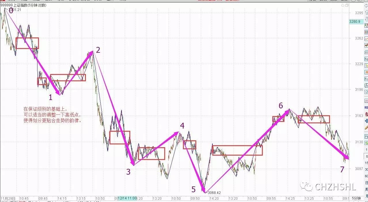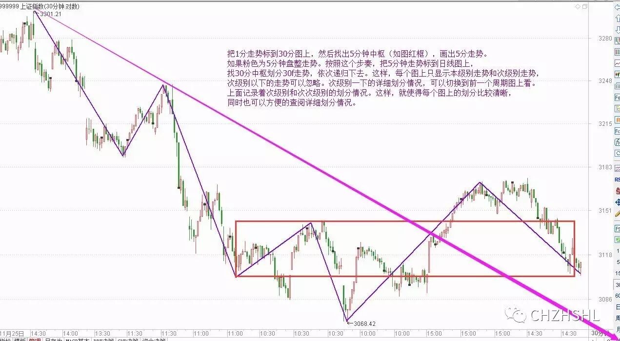 把1分走势标到30分图上,然后找出5分钟中枢(如图红框),画出5分走势。如果粉色为5分钟盘整走势。按照这个步奏,把5分钟走势标到日线图上,找30分中枢划分30f走势,依次递归下去。这样,每个图上只显示本级别走势和次级别走势,次级别以下的走势可以忽略。次级别一下的详细划分情况,可以切换到前一个周期图上看。上面记录着次级别和次次级别的划分情况。这样,就使得每个图上的划分比较清晰,同时也可以方便的查阅详细划分情况。