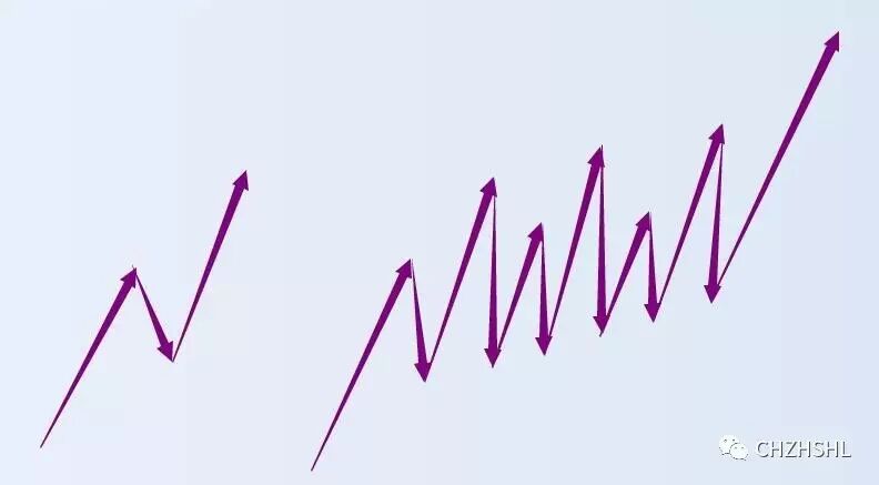 按照线段的方式,左右两个图都是1段的,如果按照这种思路去递归,那么左右两边的级别都是一样的,其实他们级别差了好几倍。这最底层,任务这两个是同一级别是可以的,不会又大的影响。但是如果每次递归都这么来,那级别的误差就会被逐级放大,到了后面,是什么级别,早就乱套了。而缠论的核心就是级别和结构,结构的级别都混乱了,这还是缠论么?!所以这对缠论初学者来说,是至关重要的,这里说明一下。