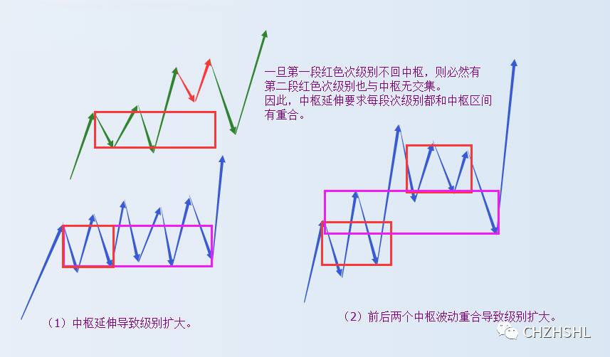 【狩猎解读】 这里缠师这里强调了两种中枢升级的方式,一种是中枢自身延伸,这种要求比较严格,要求前后两个次级波动都必须至少有一个触及走势中枢的区间。因为如果两个次级别有一个没在中枢的,那么接下来必然有一个也不回中枢,因此这里中枢延伸的含义就是每一个次级别都和中枢区间有重合。第二种中枢升级的方式是,产生新的同级别中枢与之前的一个中枢产生重合,则产生更大级别的中枢。http://mmbiz.qpic.cn/mmbiz_png/ZiavW4e0VMDZN4ibiaEWPJ2fQxAwJpickCQ08bVIYKVjMUKbsyvMbialiboybZCX3U9kKQNiaQuYu8Ld6afkkM77nDnfQ/0?wx_fmt=png缠中说禅走势中枢级别扩张及第三类买卖点" />
