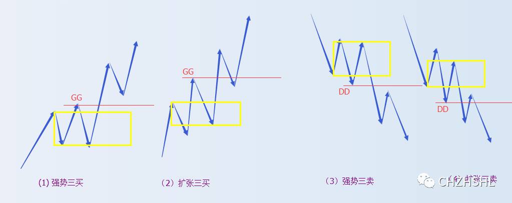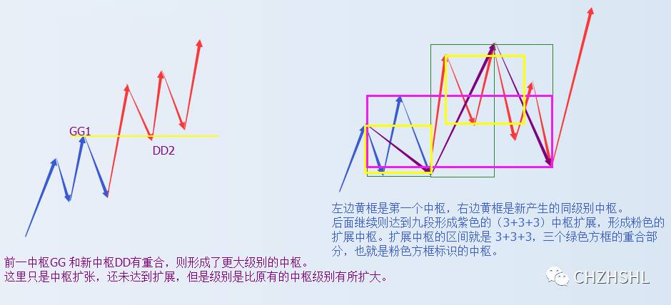 【狩猎解读】 一个中枢形成之后,除了中枢延伸外,会产生新的同级别中枢,新的中枢与第一个中枢无重合,也就是GG和DD之间不能有任何重合。如上图(2),则形成趋势。否则会产生更大级别中枢,也就是扩张或者扩展,如下图所示。针对中枢的扩张、扩展、延伸前面专门写过一篇文章,可以在微信公众号CHZHSHL下方聊天栏内回复“扩张扩展”,即可得到那篇文章,可参阅。