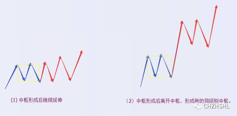 【狩猎解读】中枢形成后的两种情况分类如下图:一是中枢延伸,二是形成新的同级别中枢。需要注意的是,产生新的同级别中枢并不意味这一定是趋势;当新的同级别中枢与前一个中枢有交集(高低点有重合)时,相当于产生了一个更大级别的中枢,就是中枢扩张、扩展。下面会详细介绍。