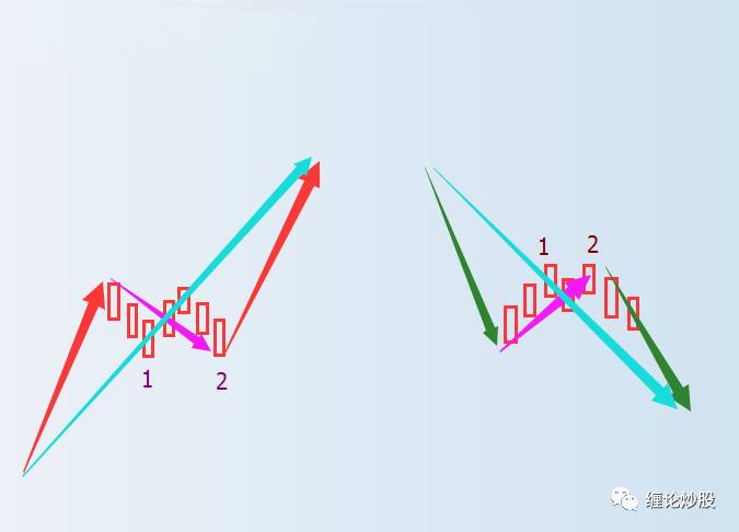 如上图两种情况,在1处都不成笔,到2时,K线数满足成笔条件,但是1和2两次高低点相同,就是没创新低或新高。这种情况下,按照定义也是可以成笔的。但是有些时候考虑到波动大小,希望创新高新低后才成笔。因此这种情况就添加了新高新低成笔这个参数,设置为1时,就表示这种情况下必须创新高了才成笔,因此上图都会画为蓝色一笔。如果设置为0,就表示允许同高或同低时成笔,上图两个就都是三笔。