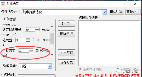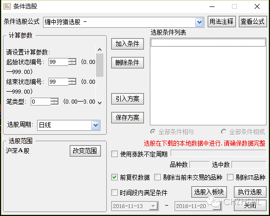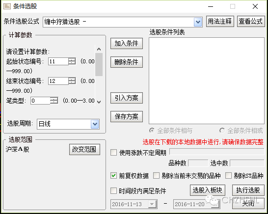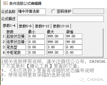 下面进入条件选股界面,缠中狩猎选股为了更好的适应大家的需求,增加了如下个参数,供大家来设置: