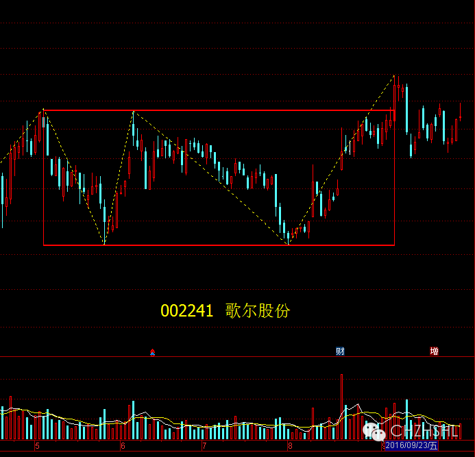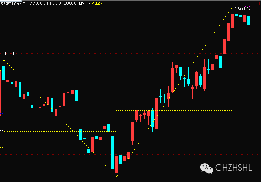 画框:就是画笔的边界框,以笔的端点为对角线,向上笔画红色方框,向下笔画绿色方框,这样类似于画段时候的特征序列,方便观察。同时加上了一笔的0.382, 0.5, 0.618的三个位置线,这样可以方便看后面的回调情况。