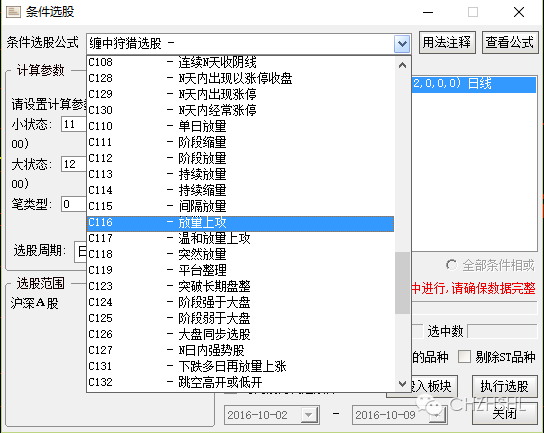 大家都知道,形态选股是根据最后一个中枢对当下进行完全分类来进行的。之前没有加中枢方向这个参数,选股经常会选出一些奇怪的类型,选下跌的时候,前面一个是上涨中枢,现在加了这个参数后,效果会提高不少。