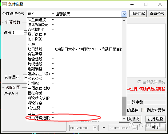 点击红圈处下拉箭头,出现选股公式列表,向下拉,在后面可以找到“缠中狩猎选股”,如下图:http://mmbiz.qpic.cn/mmbiz_png/ZiavW4e0VMDZz8VbqhibpgbcI8ZRBnvshZztALuPCfyl2A6AMqAMnq6bX4sFIepMFgJNGF25hWCxtwvgaf7cDVzQ/0?wx_fmt=png