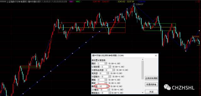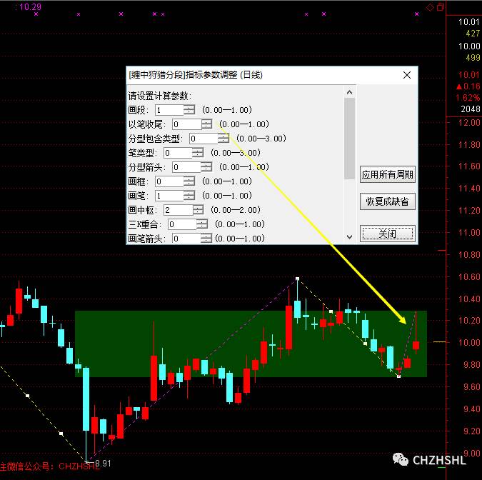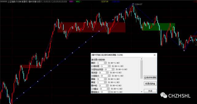 将上涨中枢和下跌中枢分别用红色和绿色区分开来,更清晰。同时增加了画中枢方框边界和画色块覆盖两种中枢显示方式。还是原来的【画中枢】参数: