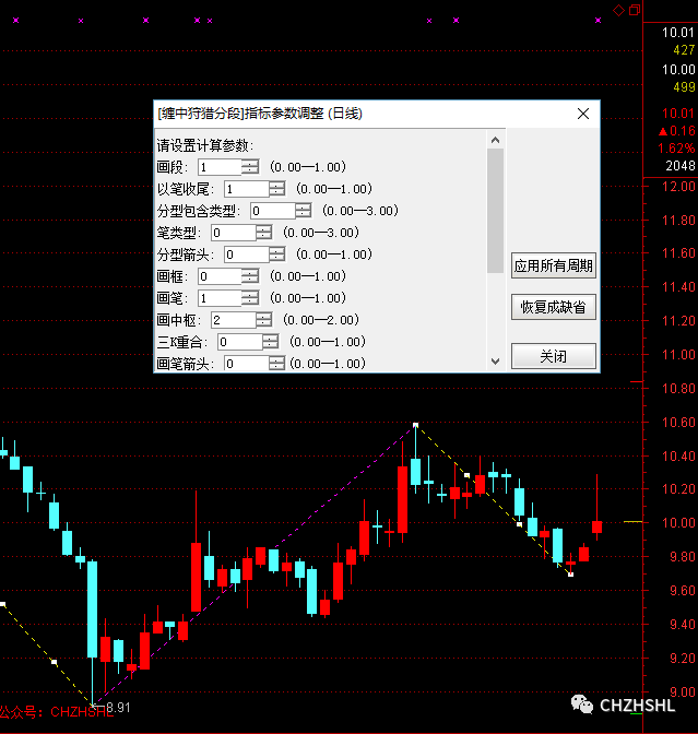 这个问题不少人反映,这个本身不是问题,只是个人习惯和个人考虑不同。最后一部分不管是否成笔,只要满足笔延续状态,最后一段在画笔时都会象征性的连上去,至于事后是不是真的成笔,程序会根据后续发展自行调整。第二个是选股时的需要。但是很多缠友不明白,老是问,最后一笔不成笔,未完成,为什么画出来了?你搞错了。。。为了满足大家的这种需求和“改错” ,现在增加【以笔结尾】这么一个参数,以笔结尾设置为1时,就是最后不成笔时不显示。效果如下图: