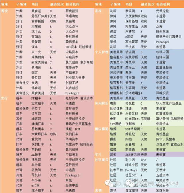 整体上看,投资阶段主要分布在天使和A轮,需求和模式在资本的助力下正进行市场验证。虽然某些细分领域,如外卖、打车,已经出现行业整合或巨头介入,如大众点评投资饿了么,腾讯投资滴滴打车、阿里投资快的打车、快的收购大黄蜂。但是,大部分还处于早期发展阶段,细分需求还没有被很好的满足。