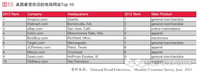 根据美国“FAVORITE50”最受欢迎的50家电子商务网站排名:排名前10位的网站中,除Amazon(B2C)和eBay(C2C)外,其余均为传统线下零售企业;