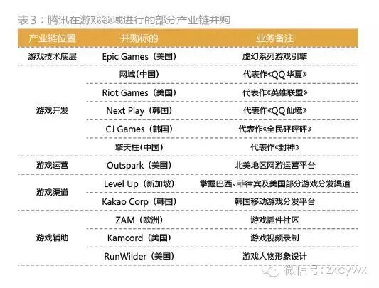 依托自己作为游戏运营商的强势地位,腾讯在自主研发游戏的同时,也在游戏产业链的上下游进行了大量的并购(表3)。